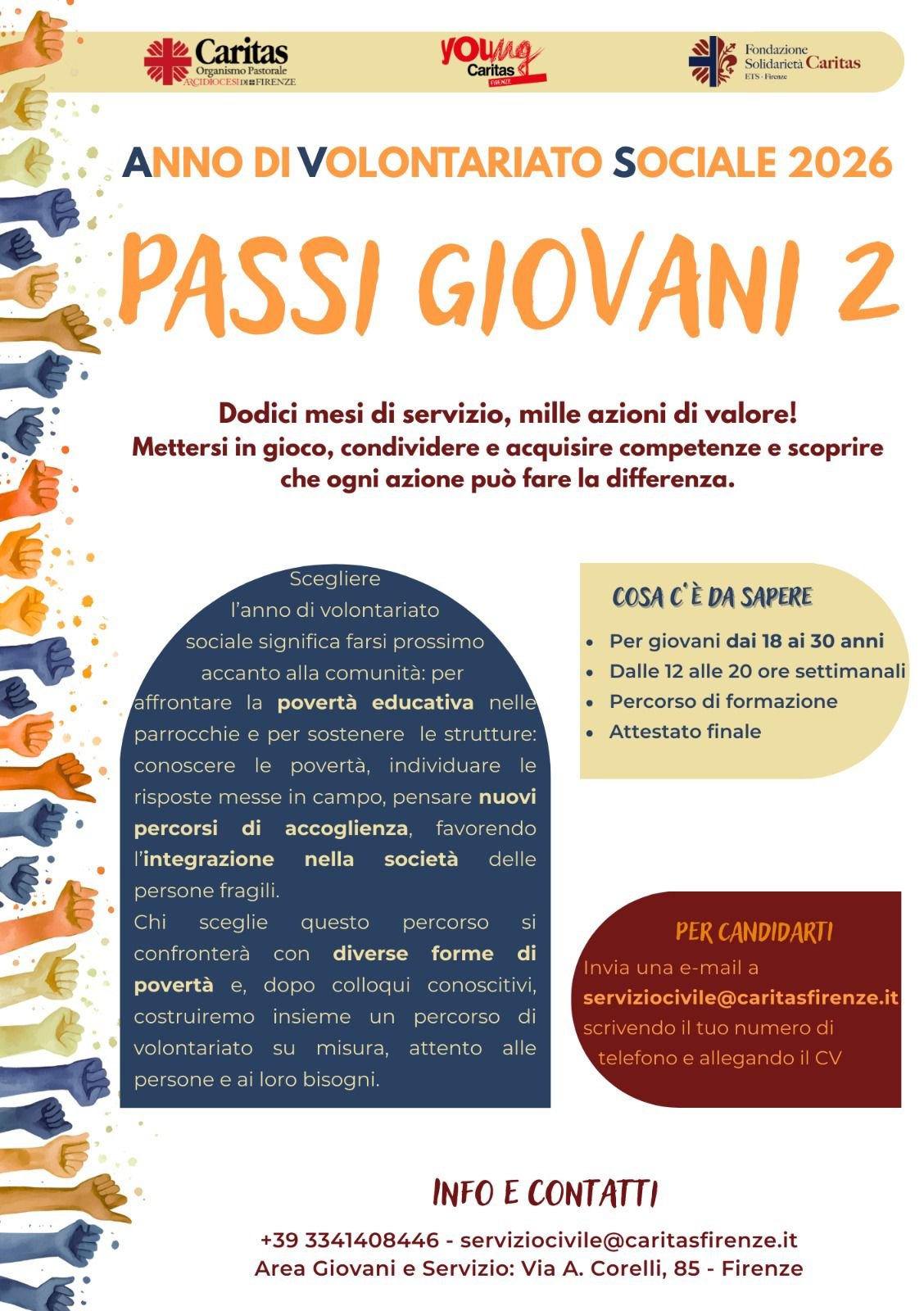 Per candidarti inviaci una e-mail a serviziocivile@caritasfirenze.it, allega il CV e lascia un recapito telefonico.